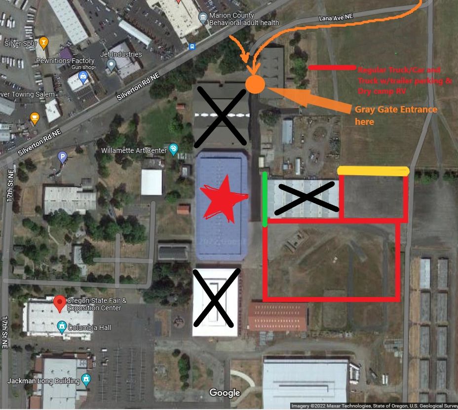 * IF YOU PARK ALONG YELLOW LINE, YOU'LL BE CHARGED $25 BY NWODGA FOR A CAMP SITE AFTER THE SHOW * We're told its limited dry camp sites, but have no further info, sorry