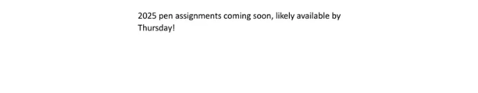 2025 Pen Assignments - Pen Setup & Tear Down will be YOUTH VOLUNTEERS! We will have a donation jar & a Pop bottle recycle bin onsite to help fund their help! Please support the HARD WORKING youth volunteers in setting up & tearing down all 240 pens that will be onsite!
